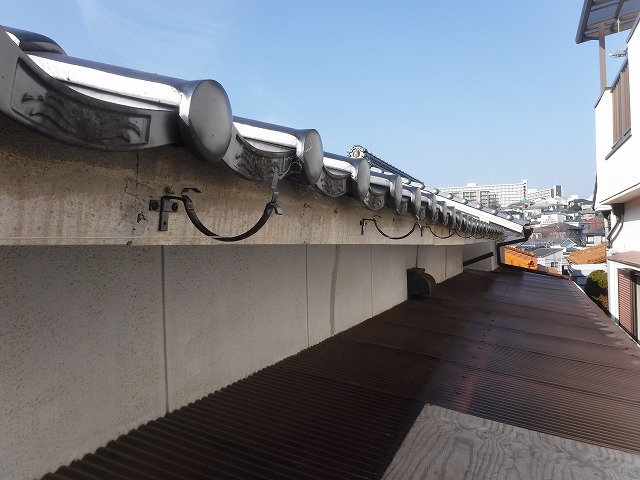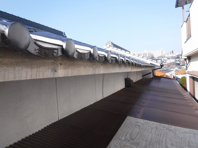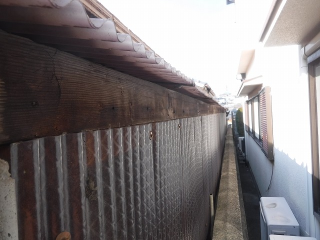 神戸市垂水区にお住まいのお客様から、「雨が降ると雨樋から水があふれてしまい、隣の家の方へ流れてしまっているようで心配なんです」とご相談をいただきました。現地を確認させていただくと、瓦屋根部分と波板屋根部分のそれぞれに設置されている軒樋から雨水があふれ、排水がうまく機能していない状態でした。特に大雨の際には樋に流れきれない水が外側へあふれ出し、そのまま隣家側へ流れてしまっている様子も見受けられました。雨樋は普段あまり意識されにくい部分ですが、建物の雨水を適切に排水する重要な役割を担っています。今回は既存の瓦屋根と波板屋根の軒樋を一度撤去し、新しい金具と樋に交換する工事をご提案し、雨水がしっかり流れる環境を整える施工を行うことになりました。
